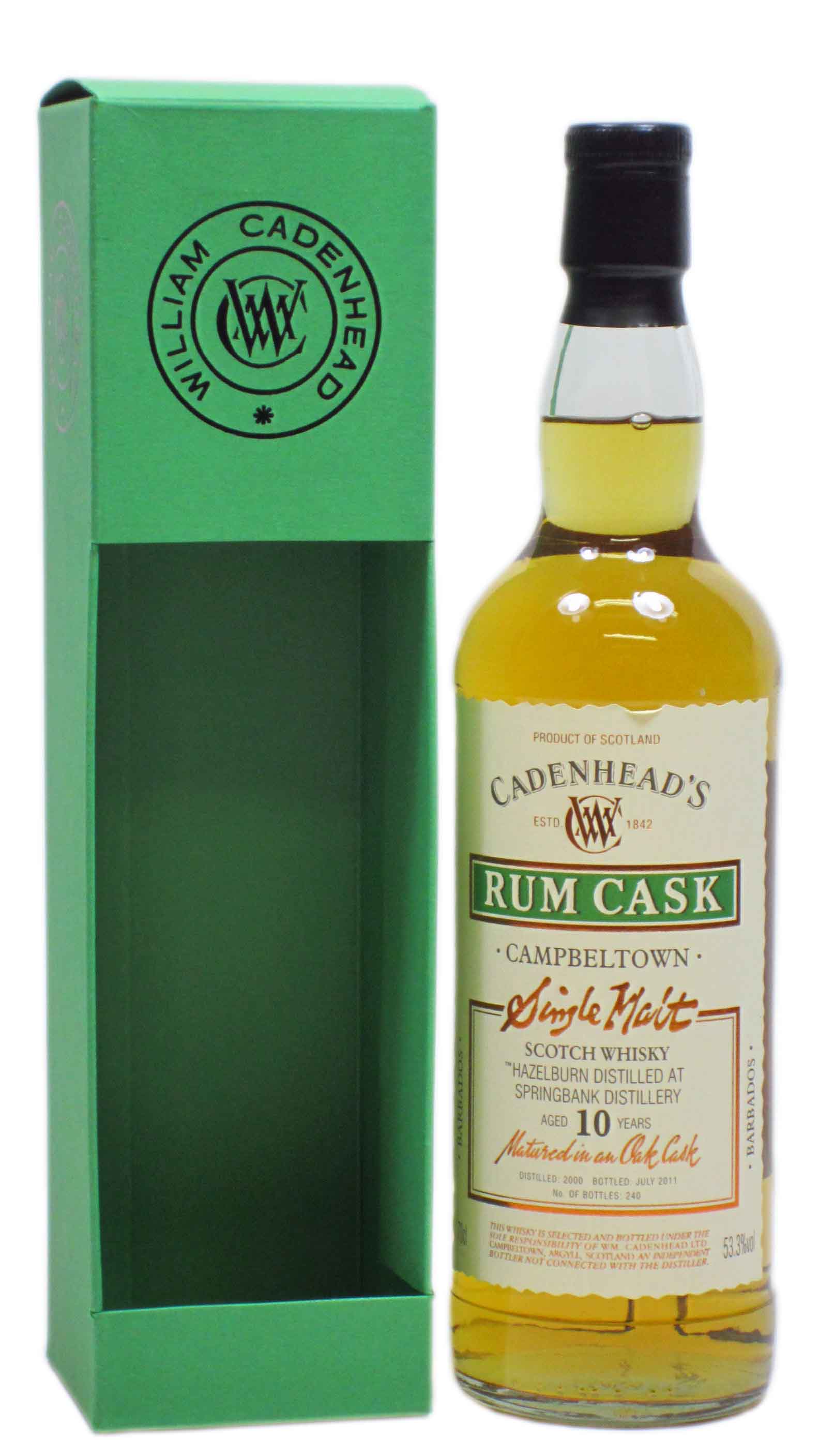 A cracking little find this. An independant bottling of Hazelburn (Springbank distillery) from Cadenheads. Matured in a Barbadian rum cask for 10 years before being bottled at cask strength. Only 240 bottles were produced from this cask. Spicy, sweet and with a very long, dry finish.
