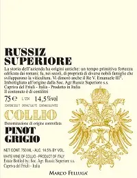 Russiz Superiore is the pride of the Marco Felluga family. The family’s winegrowing dynasty started in the late 1800s, when the current Marco Felluga’s grandfather Marco recognized the terrain’s potential for cultivating grapes. Russiz Superiore is located in Capriva del Friuli, in the heart of Collio. Its name comes from its position that rises above the surrounding hills. The estate extends over 250 acres of which 125 acres are planted to vineyards. The vineyards are located in four different villages in the Collio DOC – Farra, San Floriano, Oslavia and Cormons. Each hill has a unique microclimate and the soil is rich in marl, loam and sandstone called flysch. The fruit is all handpicked. The property is managed by Alessandra and Roberto Felluga, children of the Marco Felluga. The winemaker is Rafaella Bruno. Other text This varietal arrived in Italy’s Piedmont region inthe early nineteenth century, eventually being planted throughout northern Italy. Pinot grigio arrived in Friuli-Venezia Giulia over 150 years ago, and is now considered an indigenous grape. Today, it is one of the region’s most widely planted white grapes.