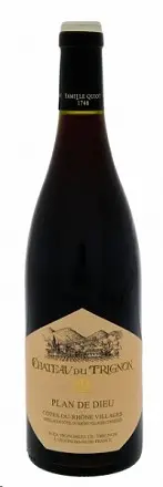 Chateau du Trignon was bought by the Quiot family in 2006. Winemakers since 1748, the family also owns Domaine du Vieux Lazaret in Chateauneuf-du-Pape and Domaine Houchart in Cotes de Provence. The family actively participates in all aspects of winemaking and has significantly improved overall quality. The estate vineyards are located in Gigondas, Vacqueyras, Rasteau, and Beaumes de Venise. In 2008, the Quiot family bought an additional 24 acres of vines in Vacqueyras and four acres in Beaumes de Venise which brought their total holdings to 150 acres. Technical notes A blend of Grenache (70%) and Syrah (30%) grown on stony alluvial terraces of Plan de Dieu, a small appellation in the southern Rhone Valley. The destemmed fruit was fermented for 21 days in stainless steel tanks, after which the wine matured in vats and barrels.
