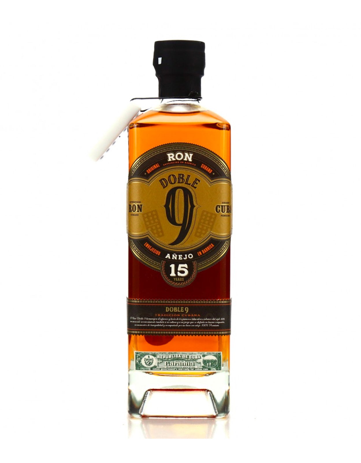 Doble 9 is a real Cuban rum inspired by Cuban identity and culture--the result of the sugar production tradition and the art of rum-making. Dark amber-coloured provided by barrels used during its long ageing. Persistent aroma, strong woody, moderated fruit, with notes of dry fruits, vanilla and coconut.