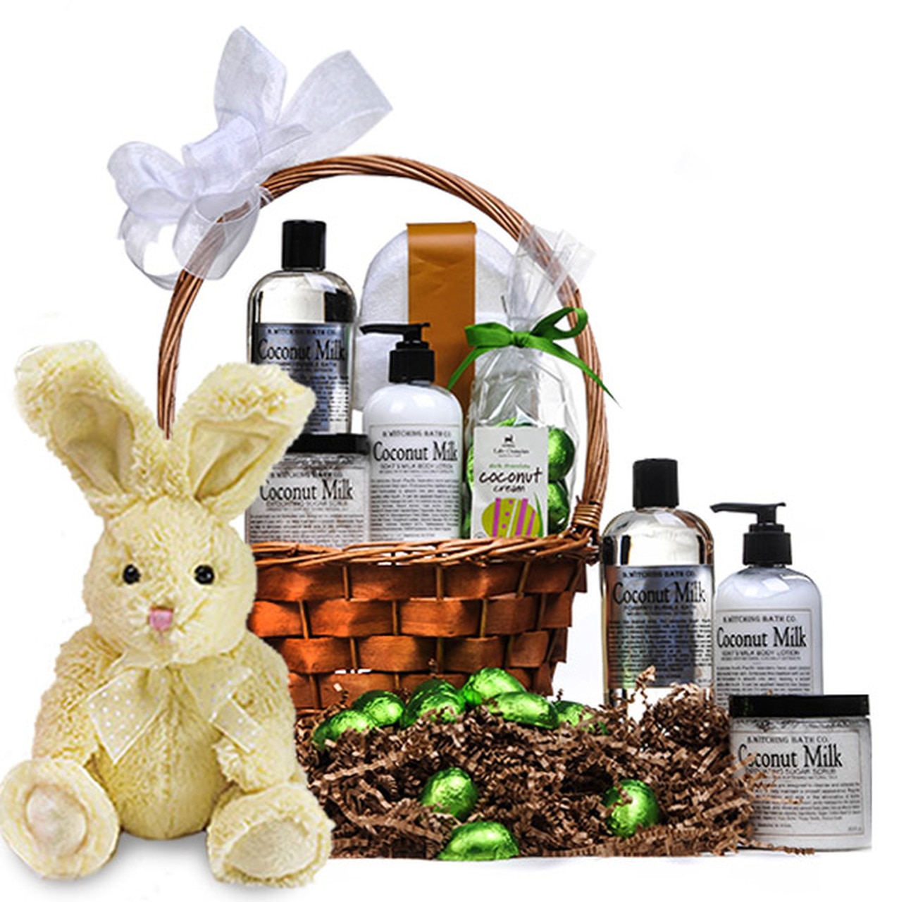 Our April Showers Easter Basket is a great way to give yourself or a loved one an excuse to relax and rejuvinate during the holiday. Includes: an assortment of B. Witching Bath Products, Coconut Milk, Shower Gel, Bubble Bath, Scrub and Lotion. Also included: a sponge, slippers, Lake Champlain Coconut Cream Dark Chocolate Eggs and a cute little bunny.